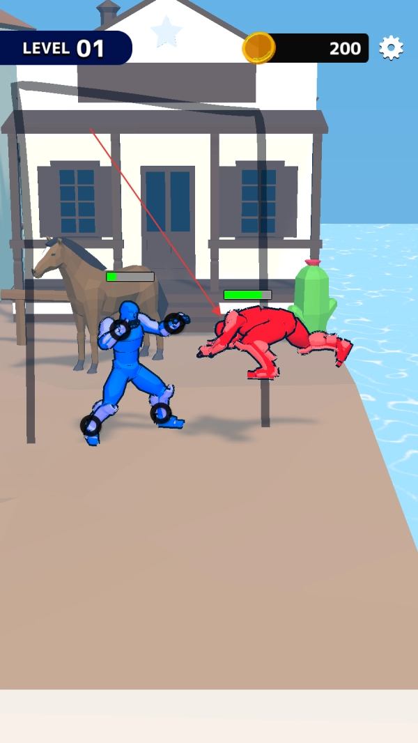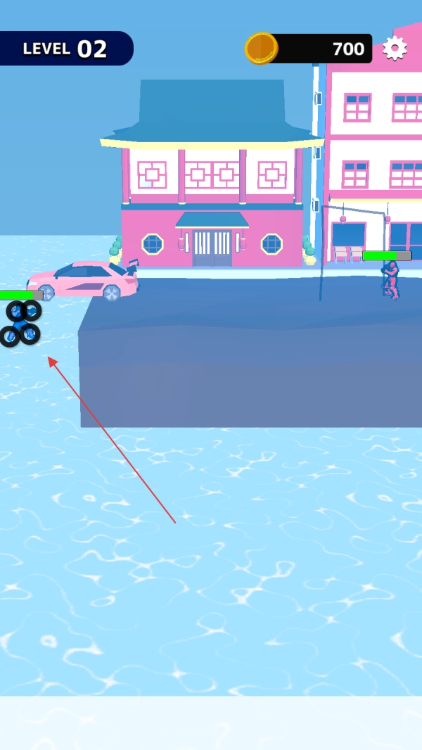 进入LEVEL-02后,蓝色角色来到水上场景,需要操控角色移动到粉色建筑旁的敌人附近,借助新场景进行战斗。