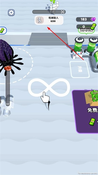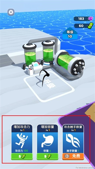 4、消耗金币来升级攻击力、容量与触手数量,以此增强毒液吞噬的效果。