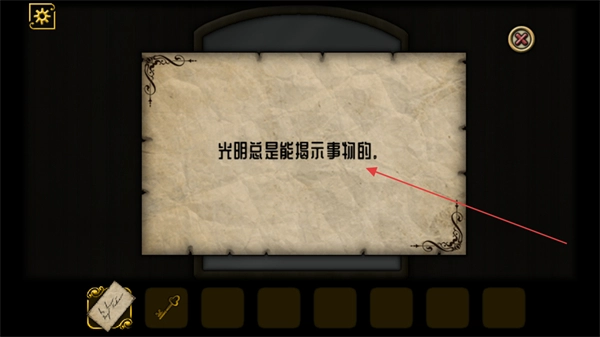 4、点击纸张可以看到光明总是能揭示事物的这段提示后,需留意游戏中与光明相关的元素,利用这类元素去探索隐藏的线索来推进游戏。