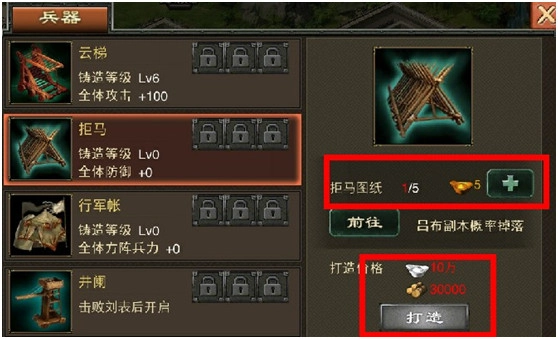 ●击败副本NPC后获得图纸,集齐某个兵器需要的图纸可以消耗一定的资源生产该兵器。