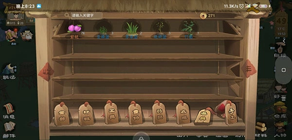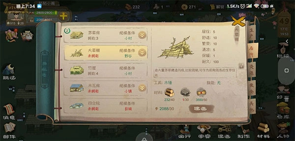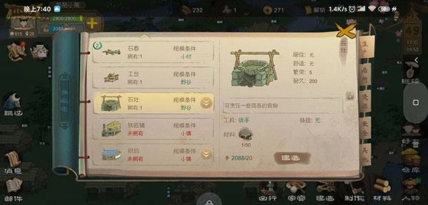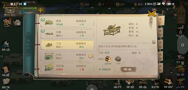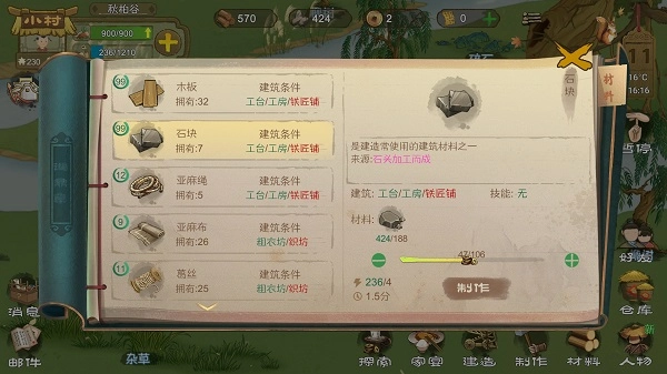 ②点击右下角的【材料】按钮,能手动生产出【石块】【木块】【麻布】【麻绳】这几种二级材料,说穿了还是石、木、麻这三类。要注意确保左上角绿色的粮食进度条处于安全状态,在这前提下尽量多囤积这些【二级素材】——毕竟制造材料会大量消耗精力值,而且蓝色的精力条千万不能让它满着,得一直让它处于恢复状态,家宴费那么大劲就是为了赚精力值呢。等繁荣值一达标,还得抽两个劳动力去建造工房……