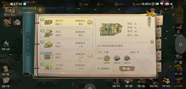 用低效率的劳动力先把吃饭的问题解决了,接下来还得考虑衣服、住房以及工具的更新迭代。具体来说,就是工台、工房、粗衣房这类【功能性建筑】;再往细了说,就是石头、木头、麻这类【常规三素材】。至于这些事物之间的先后顺序,既不用特意去记,也不用专门去学,新手引导流程会一步步带着你完成。