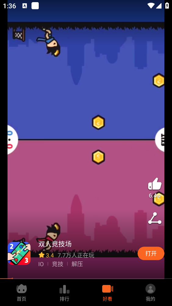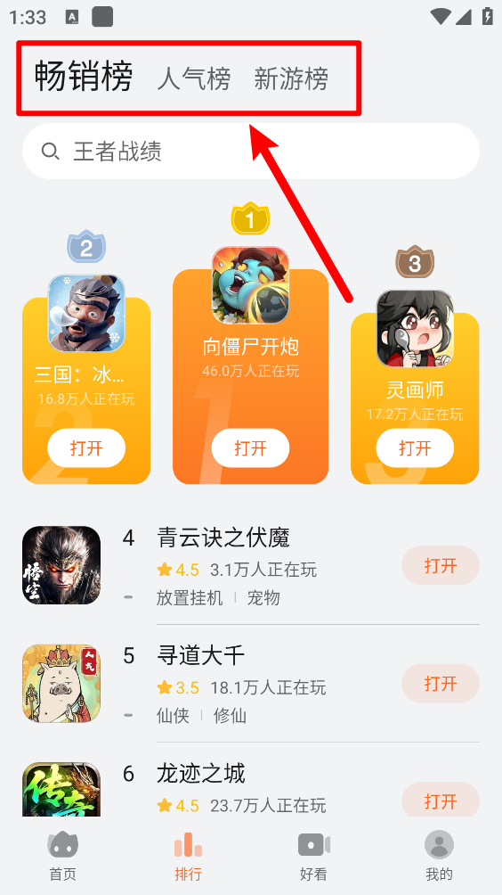5、"好看"板块上下滑动即可查看畅玩游戏的视频。