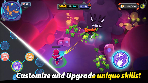 1、超多的强力角色可供玩家选择,不断升级强化来完成闯关。