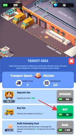 2、进入【TRANSPORT-AREA】界面后,点击【BUY】按钮,消耗50点资源来增加货车数量,从而将【Transport-Speed】提升到每分钟456的水平。