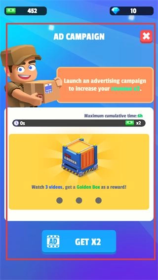 4、在【AD-CAMPAIGN】界面,参与广告活动能够提高收益,观看3个视频还可以领取【Golden-Box】奖励。