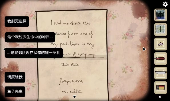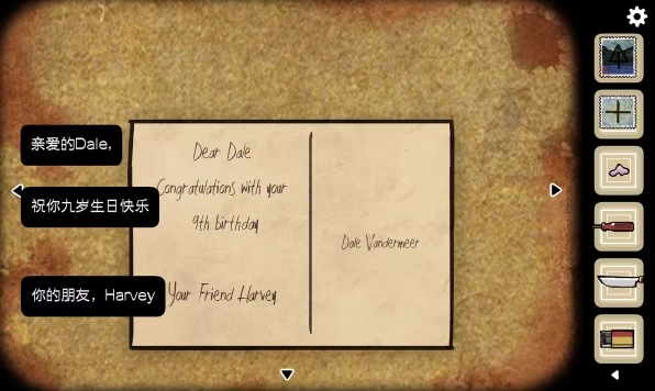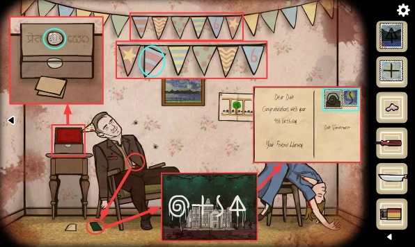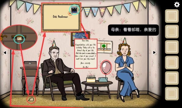 从父母的视角来看:先点击左边桌上的盒子,感觉里面有东西被取走了,我们把盒子合上,就能得到盒子上的银币;盒子前面放着兔子先生留下的信件。接着点击父亲衣服的右侧,有物品掉落,原来是一张旅馆明信片,上面有四个符号排列着,点击翻转明信片后,发现是鹦鹉哈维寄来的,还能获得右上角的两张邮票。最后把墙上的彩旗按照图示排列好,就能得到第二片彩旗。