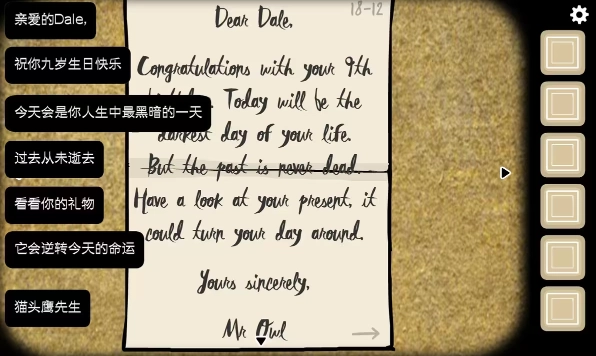 连续点击信件将其展开,发现是猫头鹰先生寄来的,内容如图所示,而右上角标注的18-12,意味着戴尔的生日为12月18日。