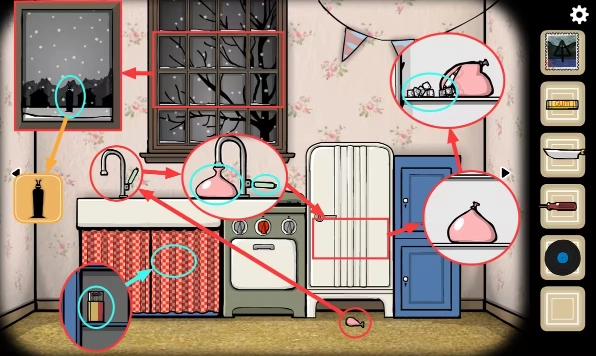 厨房视角:在水池下方的柜子右侧找到(火柴);拾起地面上的(气球),把它套在水龙头上,开启开关往里面注水,得到(水气球);将(水气球)放进冰箱,关上冰箱门后再次打开,点击扎破气球,获取(冰块);点击窗户,点击站在雪地里的兔子先生,解锁成就(兔子先生)。