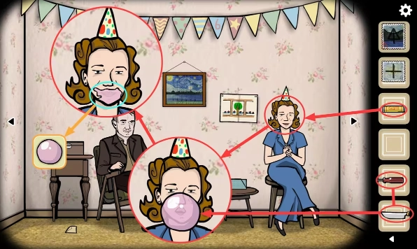 父母视角:把泡泡糖递给母亲,等母亲吹出泡泡后用刀将其扎破,就能得到那块被嚼过的泡泡糖,还能解锁成就“选择的武器”(要是用螺丝刀扎破的话,虽然也能扎破泡泡,但拿不到这个成就)。