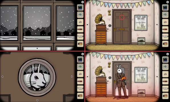 从大门这边望出去:刚才还在窗外雪地里的兔子先生突然没了踪影,我们赶紧凑到猫眼上仔细瞧——原来他已经站到了我们的门前。我们下意识地往后退了几步,紧接着就听见兔子先生开始用力砸门。门被撞开后,他径直走进房间,手里端着一把汤姆逊冲锋枪疯狂扫射,瞬间就把房间弄得一片狼藉。