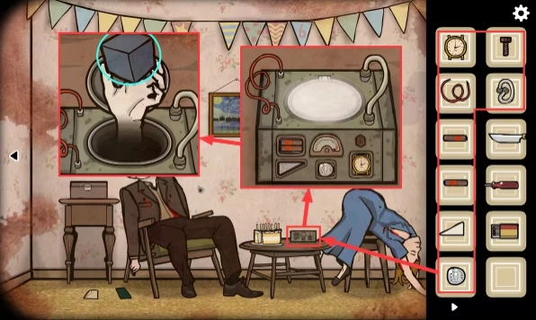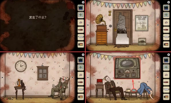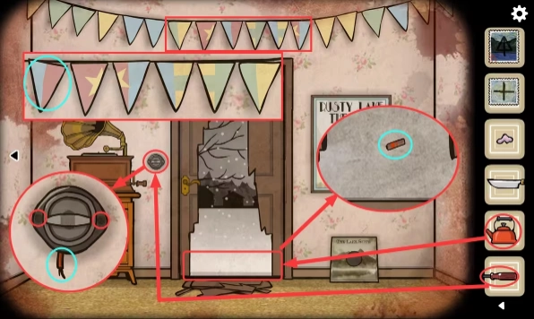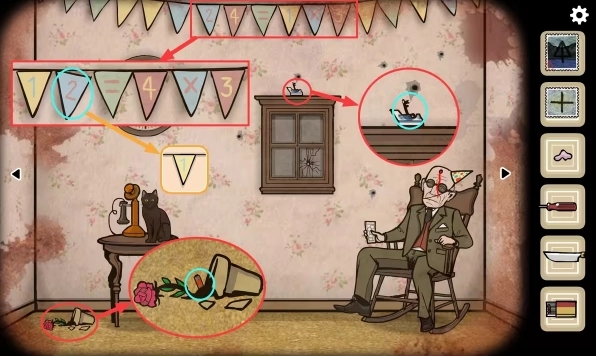 从祖父的视角来看:可以从盆栽的泥土里找到电池;能在破碎的瓶子中获取钥匙;把墙上的横幅调整成12=4×3或者12=3×4的排列形式,这时写着数字2的彩旗会松动,点击它就能得到彩旗,与此同时还能解锁成就“另一个解决方法”(需要说明的是,只要等式成立就能拿到彩旗,但只有当12出现在等号前面时,才可以获得这个成就)。