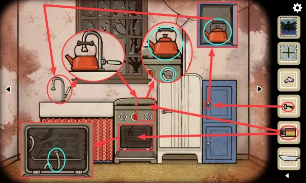厨房视角:烤箱下半部分被子弹损毁,正泄漏着瓦斯,我们划燃一根火柴扔进去,烤箱随即发生爆炸,从中得到了离子管;用钥匙打开柜子的上柜门,一只苍蝇从里面飞了出来,同时我们拿到了水壶;把水壶放在水龙头下方接水,得到了装着水的水壶;将有水的水壶放到炉子上,打开炉子的开关释放瓦斯,用火柴点燃瓦斯烧水,等水烧开后关掉瓦斯开关,点击水壶就能获得开水。