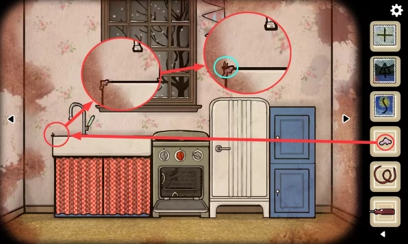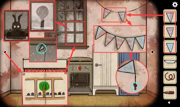 厨房视角操作步骤:先把彩旗挂到线上,按图示排列好;等彩旗的线断裂后,从线的末端拿到螺栓。接着点击窗户,因为刚烧过水,玻璃上布满了水汽,这时参照父母视角里墙上的图画,在玻璃正中间画一棵大树。完成绘画后,窗外会出现兔子小黑撞碎玻璃,这时就能获取窗户上方掉落的一小块玻璃碎片了。