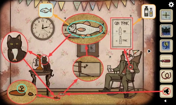祖父视角:布置好捕鼠夹后把苍蝇放置妥当,来回切换几次视角,发现捕鼠夹竟夹住了一条鱼,点击拾取鱼的同时解锁成就“意外收获”;将这条鱼投喂给桌上的黑猫,猫吃完后排出了一坨猫屎,从猫屎里找到一把钥匙;点击祖父上衣口袋里的纸条,原来是一份配方,随之获得成就“在剧院的一杯小酒”。