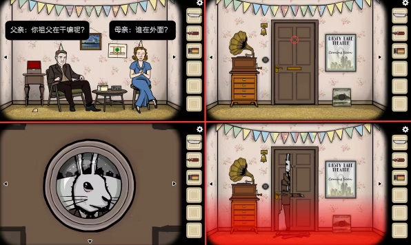 从父母的视角来看:他们又一次为我们庆祝生日,就在这时门铃再次响了起来。透过猫眼望出去,门外依旧是那位兔子先生。兔子先生破门而入,正要举枪扫射,然而另一声枪响却比他的动作更快地响起了。
