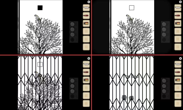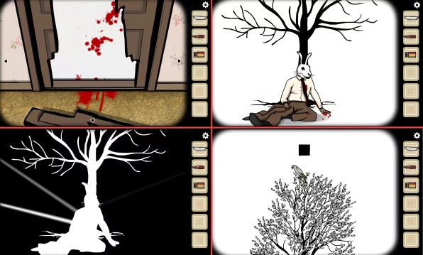 从大门视角出发:点击大门后,我们顺着血迹一路搜寻,发现兔子先生正倚靠在一棵树下;点击兔子先生,他周身泛起光芒,慢慢与树融合在一起,树也随之长出了叶子;树的顶端有个黑方块,旁边的哈维好像在守护着它,点击黑方块后它变成了白方块;电梯门重新闭合并继续向上运行;到这里,游戏就结束了。