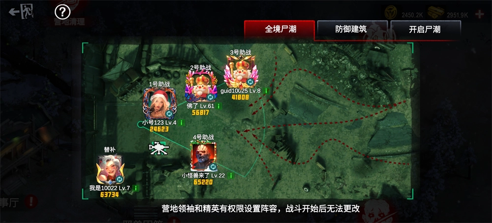挑战使用1+4模式,自己为主战可正常操作,其余4人为营地固定助战成员,由管理在开赛前指定,每次战斗均可用且没有次数限制。假设自己是2号助战,那么自己在挑战时,将启用替补成员作为2号助战参与战斗。所有助战数据和营地尸潮互通,直接读取营地普通尸潮的武器配置参与战斗,营地防御设施均可用。