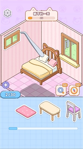 2、完成任务后,你能获取奖励与收集品,这些物品可用于解锁新房间、新道具,或是更多萌趣可爱的猫咪。