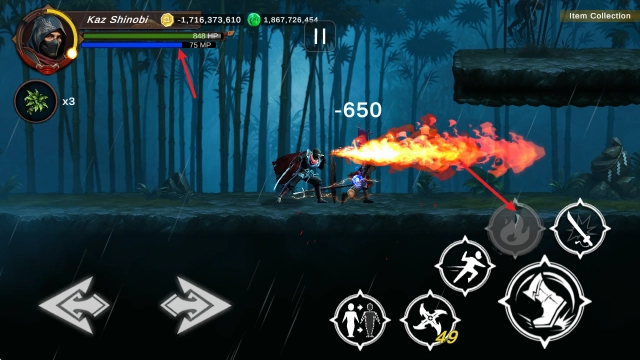 2、熟练的掌握忍者的各种技能,投掷手里剑或者发动喷火术对敌人造成伤害,也可以使用伪装术躲避攻击。