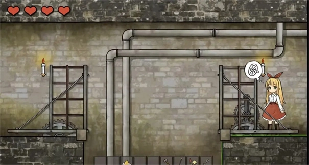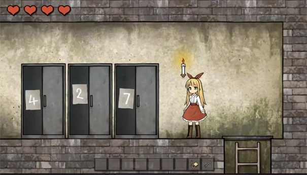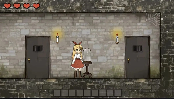 左上角的四颗♥是生命值的象征,一旦耗尽就会回到存档点重新开始。出生点位于右侧房间,而中间的玻璃罩兼具存档点与回想室的功能,完成存档操作后,方可进入左边的房间。