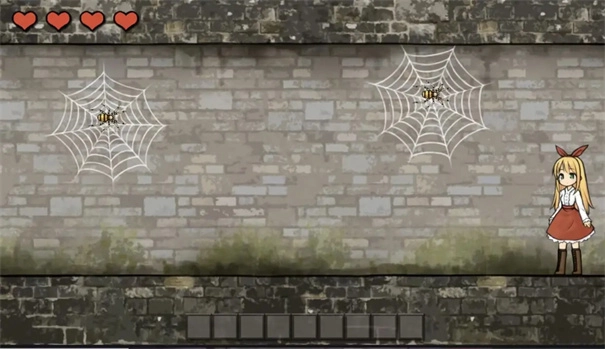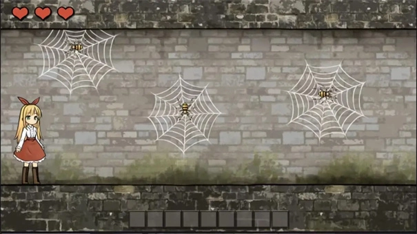 眼前出现了两只怪物,一旦被它们碰到就会失去一滴血。第一只蜘蛛需要你移动到它的正下方,接着转身;而第二只蜘蛛会从右侧跳下来追赶你,因此你要径直往前走。
