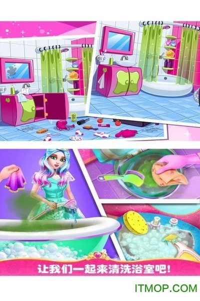 现在该打扫浴室啦,用肥皂泡泡把浴缸擦洗干净,这样小公主就能在浴缸里一边洗澡一边玩水了,你猜她会不会来一场水疗呢?