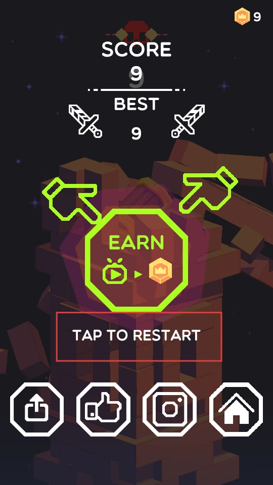 一局结束后,能查看本局得分和历史最佳成绩,点击“TAP TO RESTART”按钮即可重新开始挑战,积累的金币可用于道具升级。