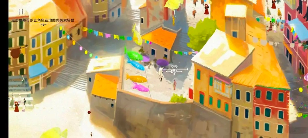 在靠近港口的那个小院落里,空中飘着五个散开的鱼气球,走进去会触发小孩子的对话。在这里得踢爆至少三个鱼气球,之后城市就会突然放起烟花。