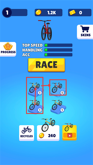 1、把等级相同的自行车进行合并,就能解锁更高级别的车辆,进而提升【最高速度】【操控性】等属性,让比赛竞争力得到增强。