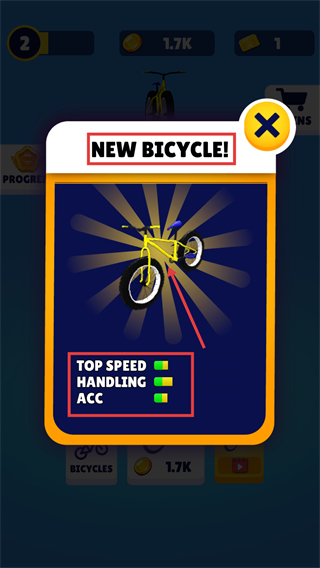 2、解锁【NEW-BICYCLE】后,它的【TOP-SPEED】【ACC】等属性会更出色,替换掉当前使用的车辆能够增强在比赛里的表现。