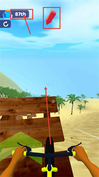 3、比赛过程中要留意当前的排名情况【87th】,按照红色箭头所指引的路线行进,这样能够避开障碍物,还能找到加速区域来提高自己的名次。