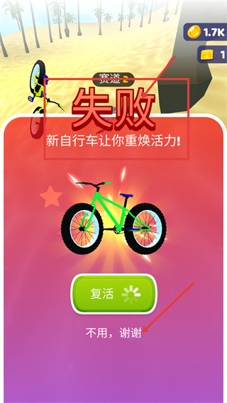 4、若出现【失败】提示,你可以选择用新自行车【复活】以继续比赛,也可以点击“不用,谢谢”来重新开始挑战。