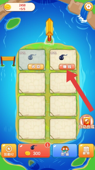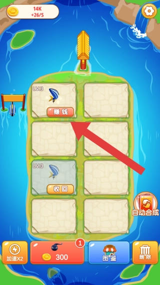呈现岛屿地图布局,有LV.8的物品格子,将它们进行合并,合并升级到最高级时可以点击赚钱去赚取金币。