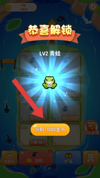 你可以移动两个小蝌蚪让它们合并,这样就能解锁新的图鉴,解锁之后还能领取1000金币,这是合成升级后获取新物品与奖励的环节。