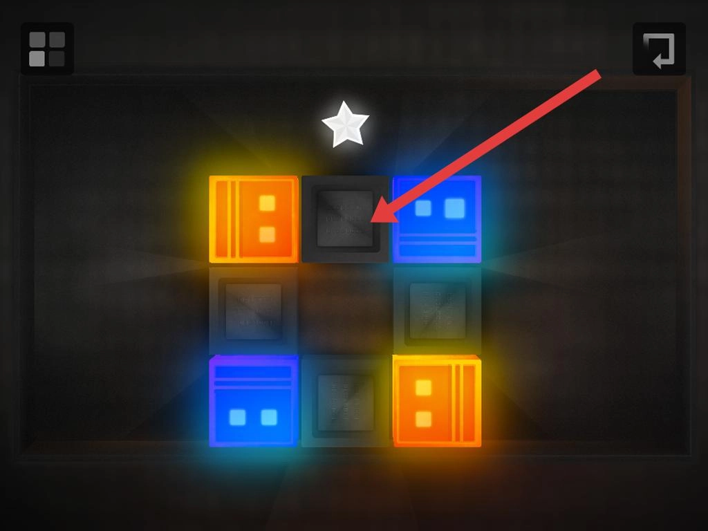 关卡里的彩色发光方块(橙色、蓝色)和黑色方块组成阵列,上方的星星是目标,通过调整方块的位置或状态来完成解谜,从而获取星星。
