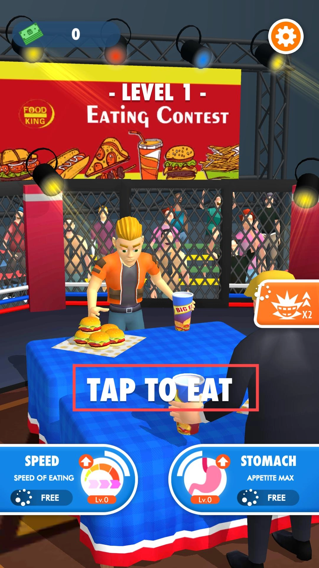 点击“TAP TO EAT”按钮即可开启美食竞赛,在游戏中需要快速点击屏幕来享用汉堡,同时留意下方的速度数值与stomach进度条,努力保持领先优势。