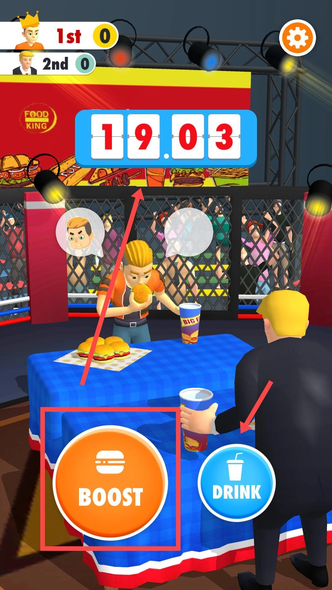 竞赛过程中要留意时间,合理借助BOOST加速吃汉堡,及时通过DRINK缓解,维持稳定的进食节奏,从而超越对手。
