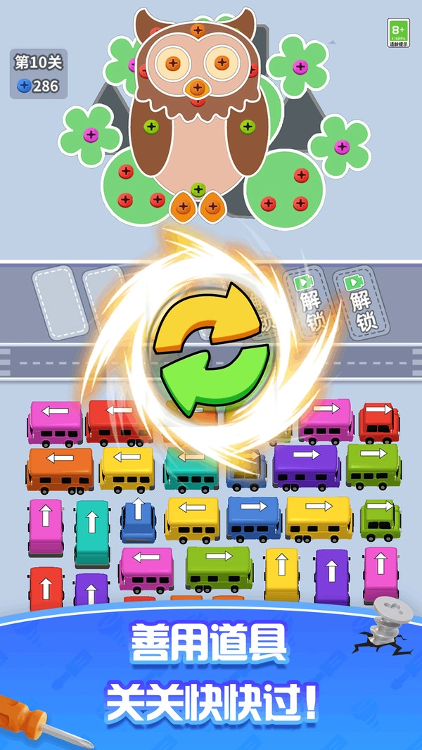 挪车神走位是一款别出心裁的益智闯关游戏。在这个充满机械美学的游戏世界里,玩家需要操控各类造型萌趣的迷你工程车,凭借精准的移动来拆解由螺丝钉构成的复杂结构。游戏中的每辆小车都装有醒目的方向指示灯和独特的色彩搭配,只有当车辆颜色与箭头方向完全一致时,才能进行联动操作。随着关卡的推进,玩家还会解锁“万能扳手”“零件重组”等实用工具,巧妙运用这些道具能够大幅提升拆除效率。