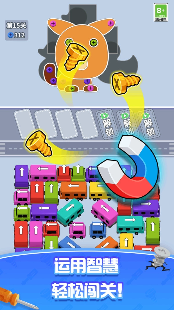 消除螺丝钉对满意图形的需求,解锁新区域、推进关卡,完成目标图形的拼接。