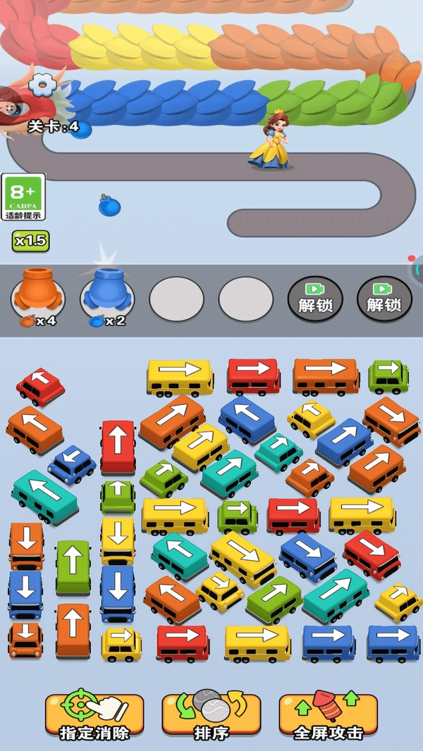 和传统三消游戏不一样,得把颜色相同、方向也一致的小车匹配起来,这样它们才能从道路上开走,给公主腾出通路。