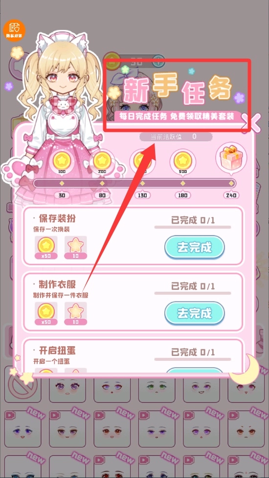 完成左侧任务栏里的新手引导任务,每个阶段完成后都能得到金币奖励,攒够金币就能解锁衣橱功能。