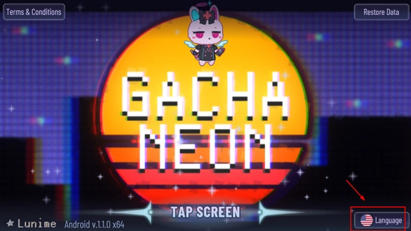 1、第一步是打开加查霓虹灯的最新版本,进入游戏后界面如图所示,接着点击右下角的Language选项;