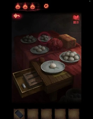 2、点击下方箭头,再点击右侧箭头,来到本章节第三个场景---忌物阁,点击中间墙面,完成转方格小游戏后,获得墙面线索(8王4鬼5口1木8虫),回到大门处,点击左侧磁盘,按照前面的个数依次在盘中放入糖瓜(8王4鬼5口1木8虫),打开抽屉获得【蜡烛】和【石板】。