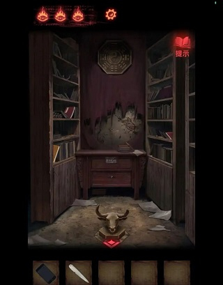 7、进入葬经阁,两个墙面上有三本书(很明显),点开后得到线索:①需要给大门处男童女童供奉玩具,男童供奉刀(老头处右边老头手里拿的那个),女童为能鸣之物;②生辰阴阳;③三大贤的生辰八字,以及坐化物。结合二三,可得室内中间柜子上的密码从上到下为(阳阳阳阴,阳阳阴阳,阴阴阳阳),获得【画像】。