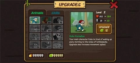 升级规则:可以使用通关获得的奖励树叶来提升等级,每提升一级,生命值增加4点,攻击力提升1点。