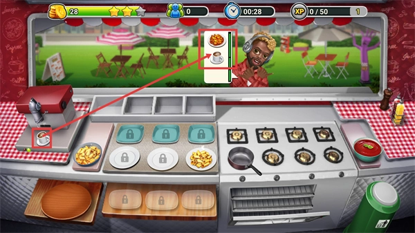 1、根据顾客需求栏显示的【餐食】与【咖啡】,先点击对应制作设备(如咖啡制作机)来准备餐品。