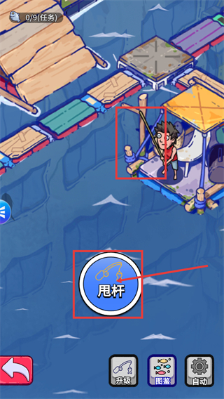 2、在钓鱼界面点击【甩杆】按钮,触发抛竿动作,配合任务要求【0/9(任务)】的进度,持续完成抛竿操作。