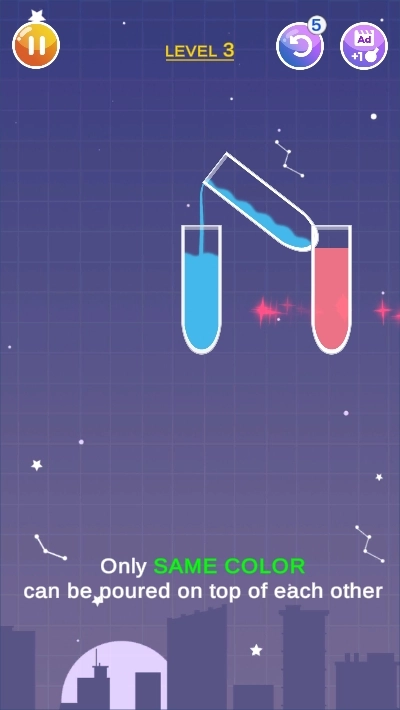 游戏设有过关模式,画面采用丰富多样的色彩搭配,玩家只需点击操作,就能从种类繁多的液体中进行选择。