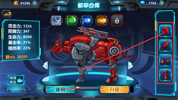 1、在【机甲仓库】查看当前机甲的【攻击力-1335】【战斗力-28385】等属性,点击【使用】可切换该机甲出战。